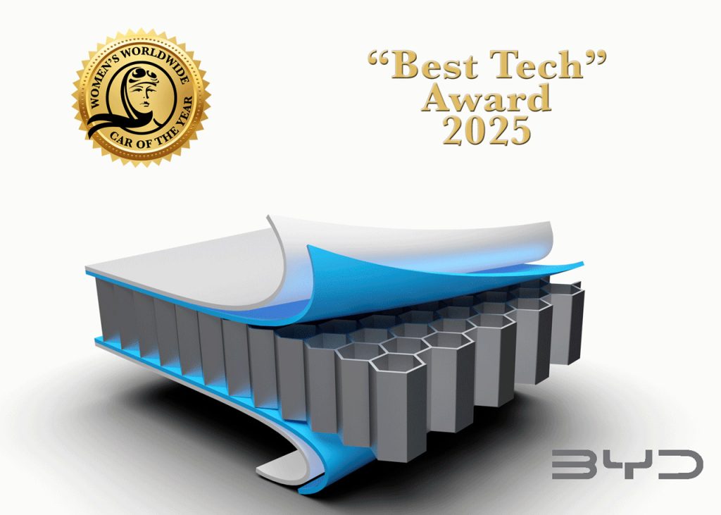 Na 15a edição dos prémios Women’s Worldwide Car Of The Year 2025, a organização galardoou a BYD com o Prémio “Melhor Tecnologia”, referindo que “a BYD deu um grande passo em frente na mobilidade elétrica com a sua tecnologia de baterias Blade. Estas baterias LFP oferecem uma maior densidade energética, maior segurança, menor risco de incêndio, uma vida útil mais longa em comparação com as baterias tradicionais e uma maior autonomia. Também fez avanços na tecnologia híbrida plug-in com o sistema DM (Dual Mode).